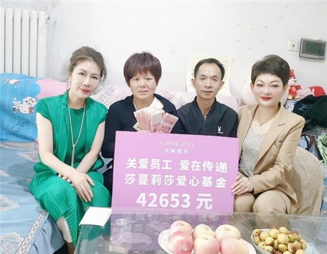 爱心基金惠及每一位莎蔓莉莎员工。家庭遇到困难的员工,爱心基金给他们援助,让她们感受到企业的无私大爱和庄总的亲切关怀;在工作上表现突出的优秀员工和优秀团队,爱心基金给她们奖励,让这些与莎蔓莉莎一起成长、不离不弃的莎蔓莉莎人,感受到企业对她们的重视和庄总的关爱;员工家里遇到红白事,爱心基金给她们祝福和慰藉,让他们感受到“一家人”的爱和温暖。