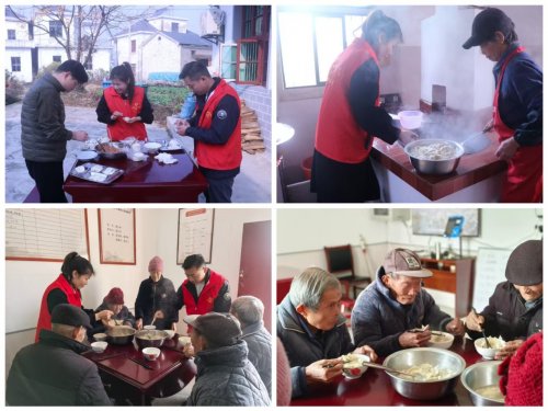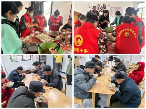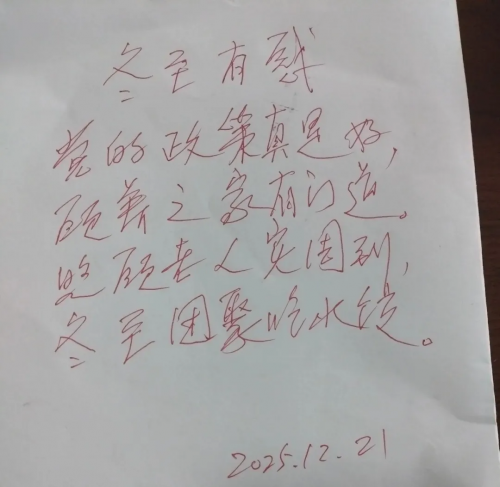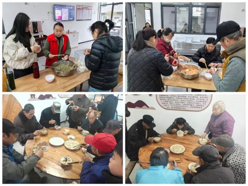 饺子出锅后,志愿者们迅速将热气腾腾的饺子盛到碗中,热情招呼老人们围坐品尝。老人们一边享用着鲜香可口的饺子,脸上一边洋溢着幸福的笑容,纷纷称赞:“这饺子味道地道,吃在嘴里,暖到心里!”席间,志愿者们与老人们唠家常、问冷暖,细心了解他们的生活状况和实际需求,用陪伴与关怀践行尊老敬老的传统美德。新塘畈村的一位大爷吃得格外香甜,即兴创作了一首打油诗:“党的政策真是好,颐养之家有门道。照顾老人实周到,冬至团聚吃饺子。”朴实的诗句引得众人拍手叫好,也道出了老人们心中满满的幸福感。
