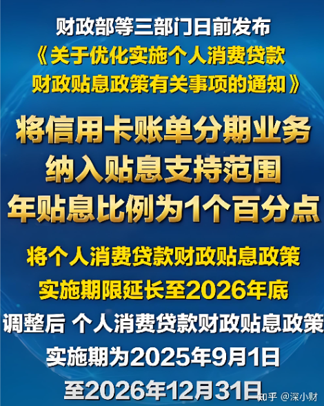 按照最新政策,除了将信用卡分期业务纳入贴息范围,个人消费贷款财政贴息政策实施期限也将延长至2026年底。