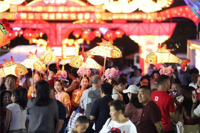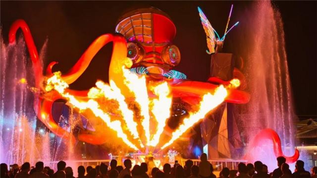 夜幕降临,万盏新春花灯璀璨绽放,多组马年主题灯组气势恢宏,游客纷纷驻足打卡。俄罗斯游客感叹:“这是我们第一次在中国过春节,这里的灯会太美了,活动很丰富,让我们感受到了浓浓的中国文化。”一旁的大型《水火交响》震撼上演,非遗火技、鱼灯巡游、财神送福轮番登场,现场人头攒动。红色娘子军实景演出夜间场同样座无虚席,成为外国游客夜游热门选择。