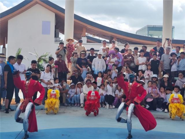 景区以“万灯耀新春·非遗过大年”为主题,每日近百场免费演出轮番上演。非遗体验区内,鱼灯巡游、雄狮贺岁、非遗火焰秀、黎苗歌舞等节目精彩纷呈,中外游客一起写福字、做拓印、跳竹竿舞;大章鱼舞台上,穿狮服的机器狗与机器人灵动起舞,传统年俗与现代科技巧妙融合,引得孩子们欢呼互动。活动期间,景区获央视CCTV-1《晚间新闻》、CCTV-13《万马奔腾中国年》《新闻直播间》三次聚焦报道,镜头捕捉园区热闹景象与浓郁年味,向全国展现了三亚自贸港新春的欢腾气象与中国年的独特魅力。