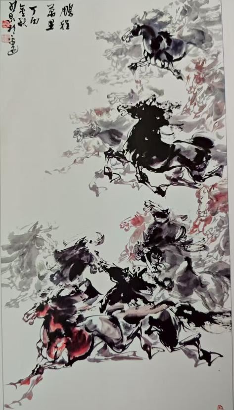 在代表作《百骏追梦图》中,王少泉更是将平遥的地域情怀与艺术境界融为一体。群马布局暗合《清明上河图》的叙事性,却藏着平遥古城街巷的层次感:近处双马并驰如古城里相携而行的乡邻,中景马群奔涌似古城集市的热闹,远方孤马凌空若古城人对未来的向往。墨色运用上,淡墨染出平遥清晨的薄雾,焦墨勾勒出骏马的肌肉轮廓,泼彩再现古城晚霞的绚烂 —— 这幅画,是马的史诗,更是王少泉对家乡平遥的深情回望。