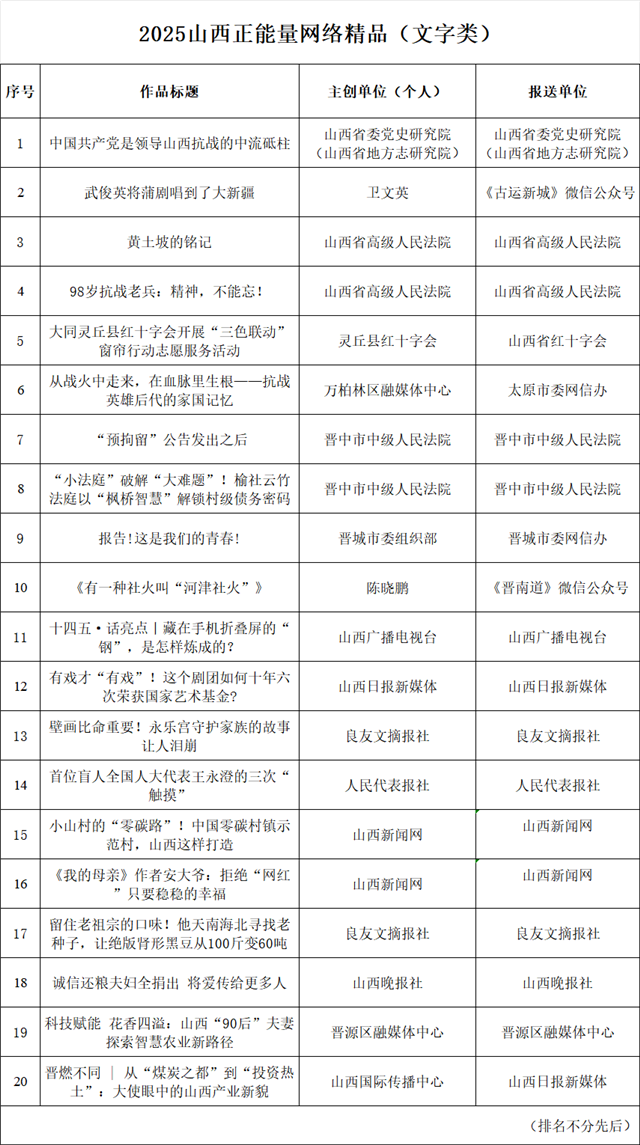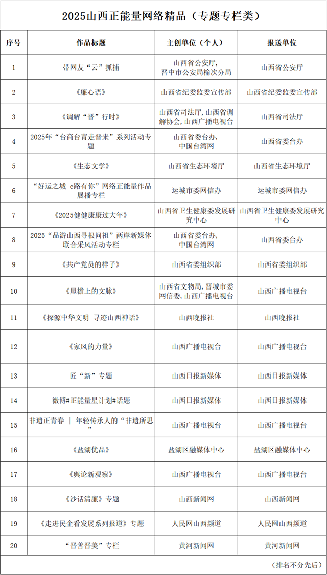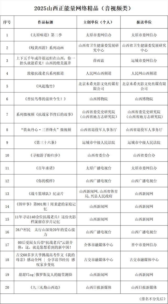 2025山西正能量网络精品展播活动结果出炉,现拟对入选作品进行公示,公示时间为2026年1月29日至2026年2月4日。公示期间欢迎社会各界监督、评议,有关意见可发送至邮箱sxwlxcc@163.com,我们将及时受理、认真核查。公示期满后将适时对外发布最终结果,并在线上进行集中展播。